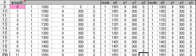 アイテムは、mode, p0, p1, p2, p3 の5つのパラメータで定義します。
